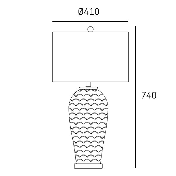 The base of the Murcia lamp is made of white, glazed ceramic, with a pattern resembling overlapping scales or waves. They are delicately highlighted with a pale brick color. At first glance, the lamp appears white, but only when we start looking at the details do we see this subtle contrast. The metal elements are finished in brushed brass.