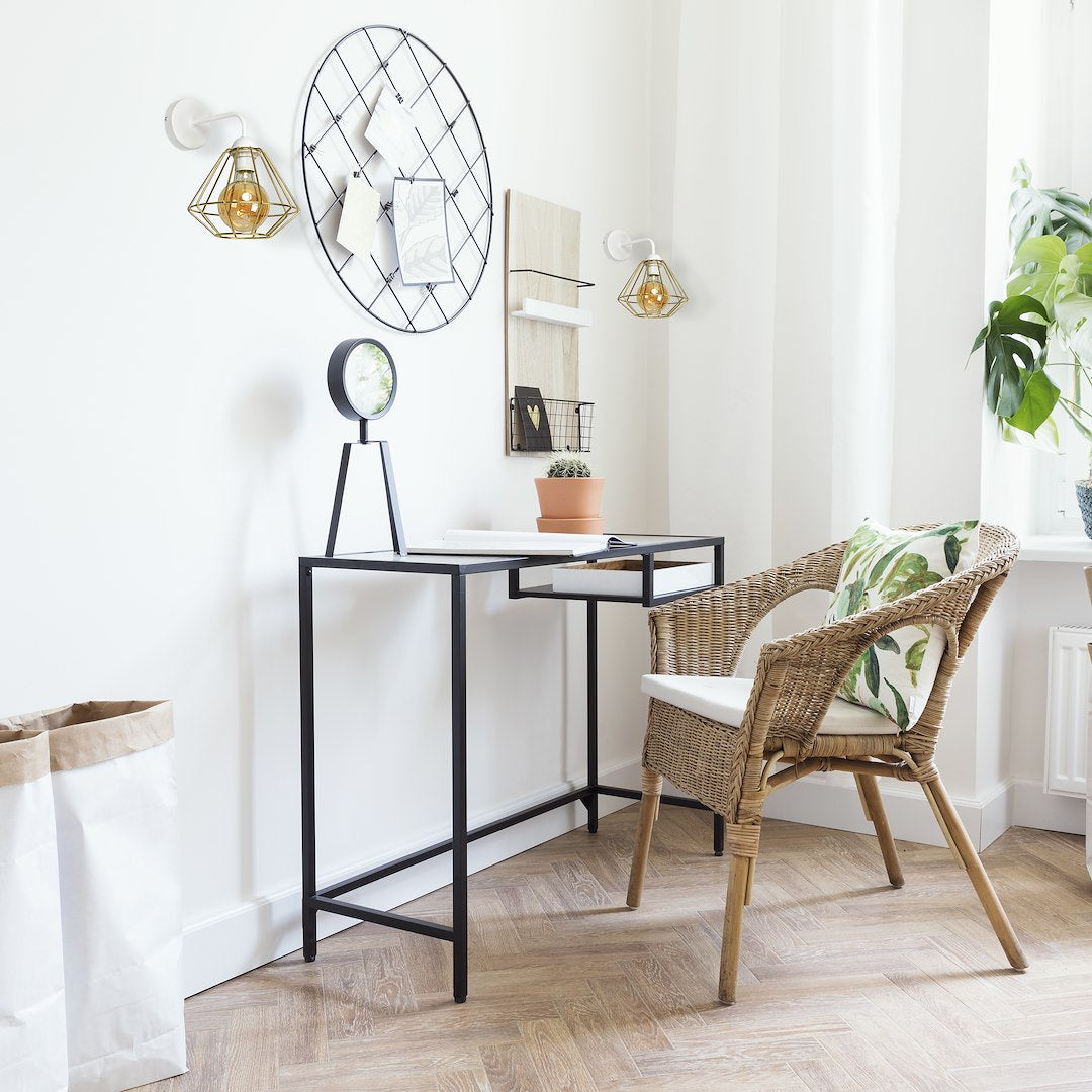 LUPO - a breath of modernityLUPO collection created by the Polish brand MiLAGRO. Lamps from this series are a real treat for fans of industrial style in a slightly more subtle, elegant version. The line includes: a wall lamp, a hanging lamp with one and three light points and a floor lamp. The distinguishing feature of this collection is the lampshade, which, despite its structure and the heavy materials used, creates an extremely light form. A golden wire lampshade in a strong trapezoidal form is placed on a simple structure available in black or white. This design will fit perfectly into interiors in a loft, austere style. The beauty of the lamp will certainly be emphasized by white, gray, graphite, raw wood and brick. LUPO lamps will work very well as a light source in a spacious living room, home office, bedroom or kitchen. Several lamps from this series in one room will look extremely impressive. The wire lampshade allows light to pass through, while beautifully displaying the bulb inside. LUPO - Polish production from the MiLAGRO brandOnly carefully selected materials of the highest quality were used to make this series. The choice here is made of metal - resistant to scratches and all types of mechanical damage. An additional advantage of hanging lamps is the ability to adjust their height, so they can be hung anywhere, even on a table or sofa. It is between 50-90 cm. All lamp models have room for E27 light sources (the bulb is not included in the set). The series is covered by a warranty by the Polish brand MiLAGRO. It is 2 years. The LUPO collection from the Polish brand MiLAGRO includes: white wall lamp with a gold shade MLP6265 black wall lamp with a gold shade MLP6269 hanging lamp with one light source, black with a gold shade MLP6270 lamp hanging lamp with one light source, white with a gold shade MLP6266 hanging lamp with three light sources, black with a gold shade MLP6271 hanging lamp with three light sources, white with a gold shade MLP6267 gold floor lamp with a black shade MLP6272 gold floor lamp with a white shade MLP6268