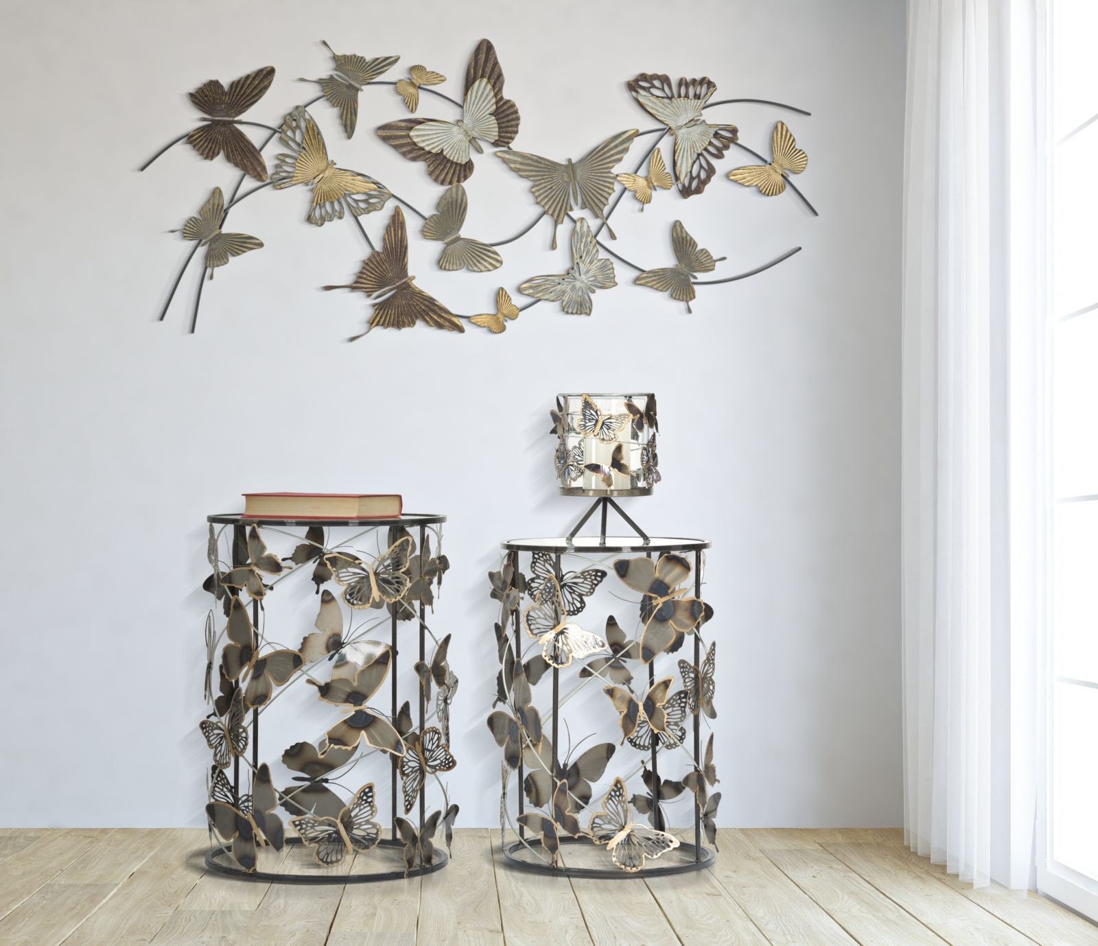 Pair of Round Metal & Glass Tables – Butterfly Decoration