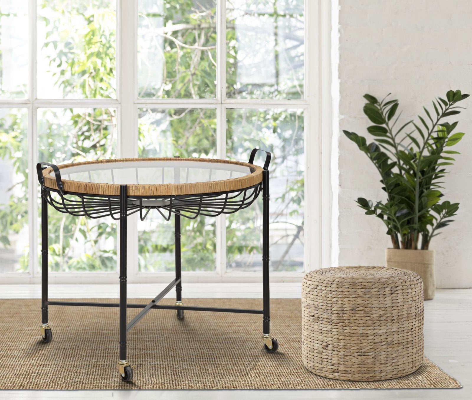 Round Low Coffee Table with Rattan-Framed Glass Top & Wheels