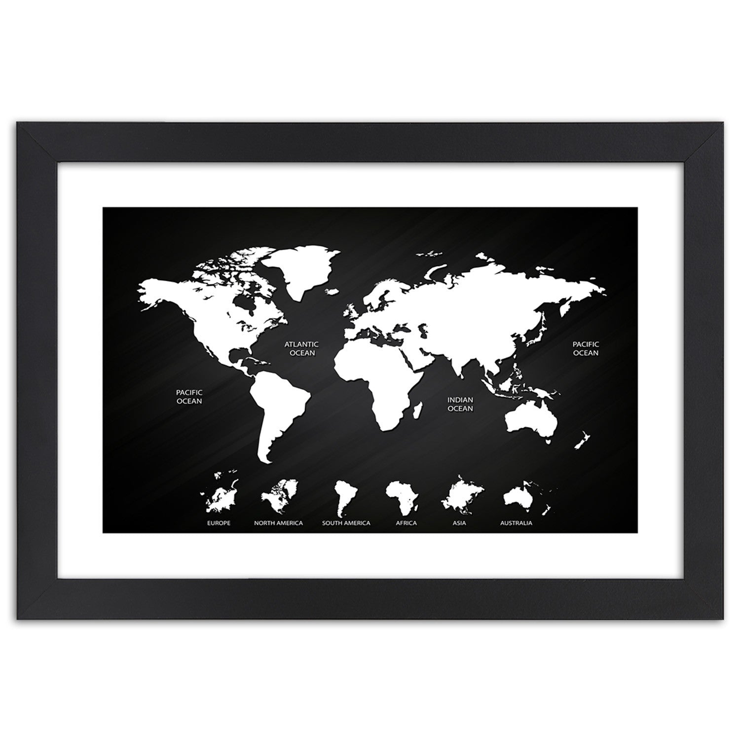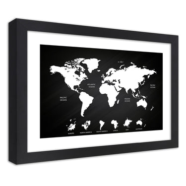 Picture in black frame, Contrasting world map and continents