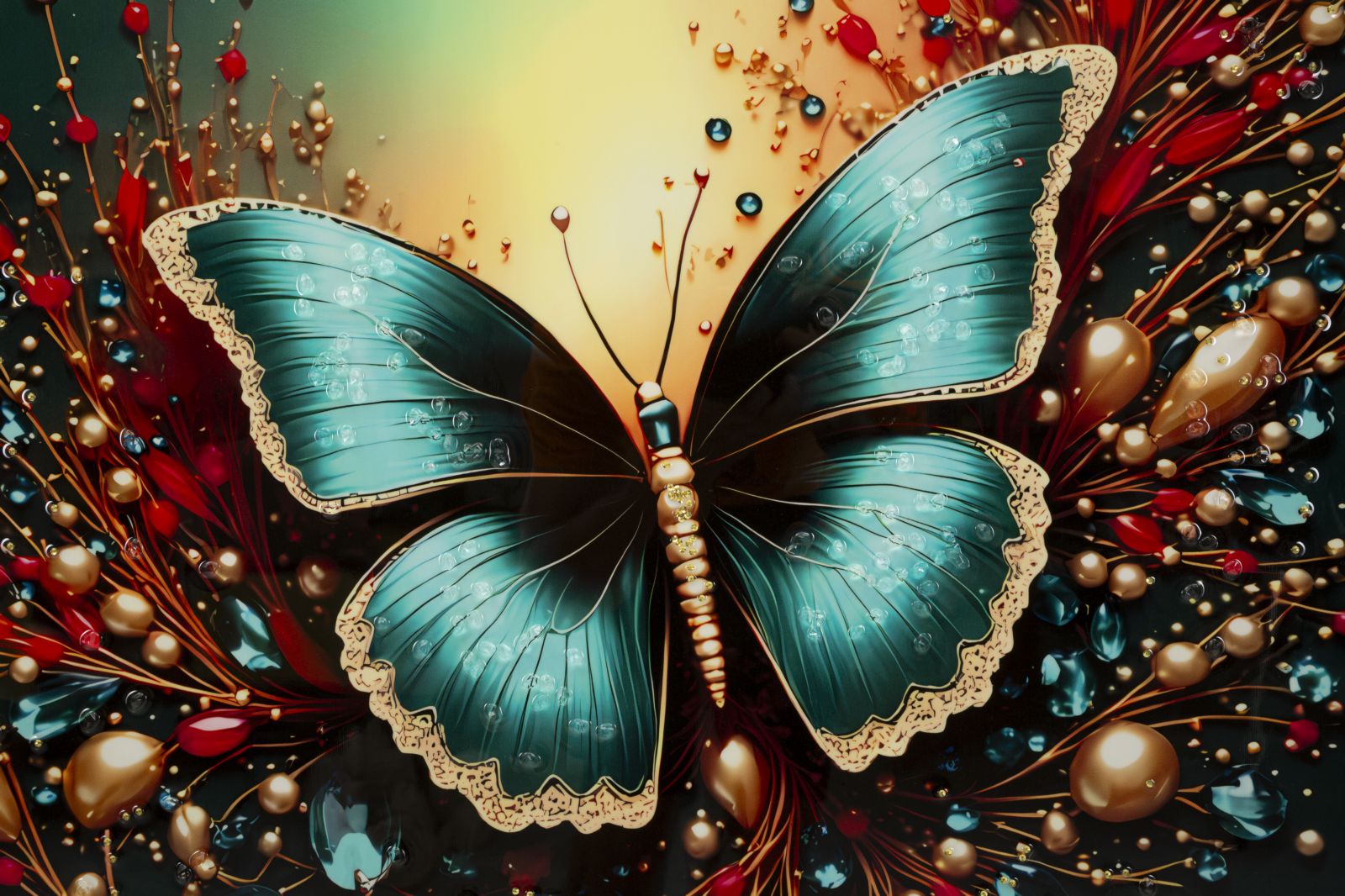 Impression sur toile de Mauro Ferretti représentant un papillon laqué, encadrée de bois de sapin.