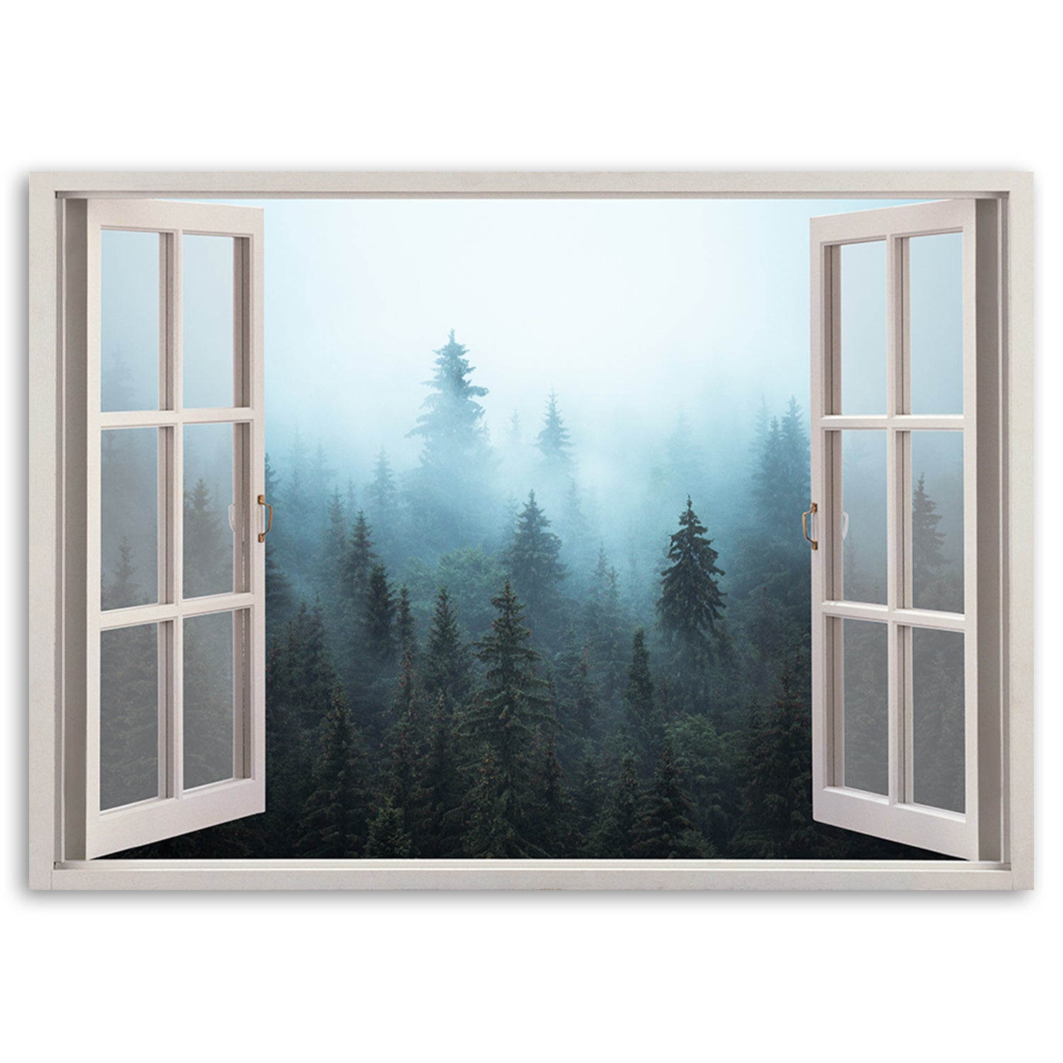 Panneau décoratif imprimé, Vue par la fenêtre sur la forêt dans le brouillard, nature