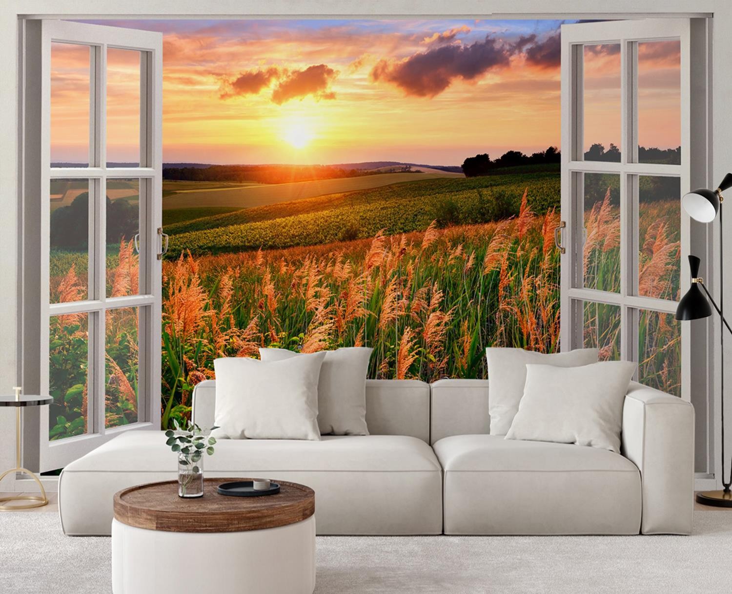 Wallpaper, Window view sunset over meadow